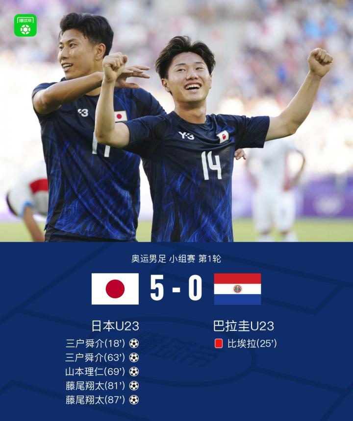 7月25日凌晨,奥运男足小组赛首轮比赛中,日本U23队迎战巴拉圭U23队。上半场,三户舜介首开记录。随后,比埃拉脚踩平河悠,主裁观看VAR后直红将其罚下。下半场,三户舜介冲顶再下一城。齐藤光毅助攻,山本理仁破门锁定胜局。随后,藤尾翔太替补登场头顶脚踢上演梅开二度好戏。全场比赛结束,日本国奥5-0大胜十人巴拉圭国奥。