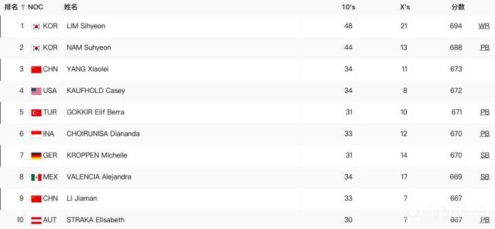亚运三金王、韩国队的林是见694环打破世界纪录排名第一,她的队友南秀贤688环排名第二。