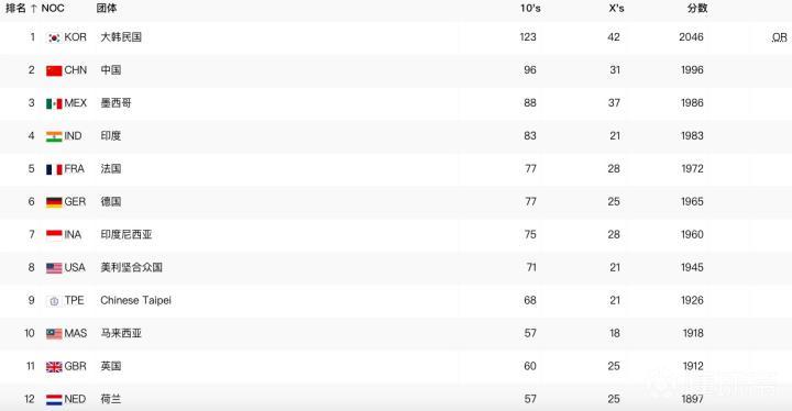 韩国女团2046环打破奥运会纪录排名第一,中国女团1996环排名第二,直接进入1/4决赛。