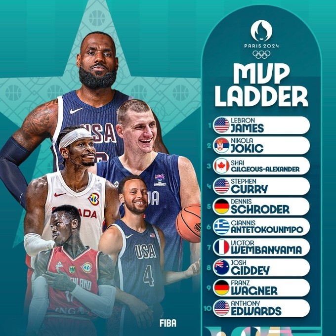 巴黎奥运男篮首期MVP榜:詹姆斯领跑,约基奇第2,库里第4