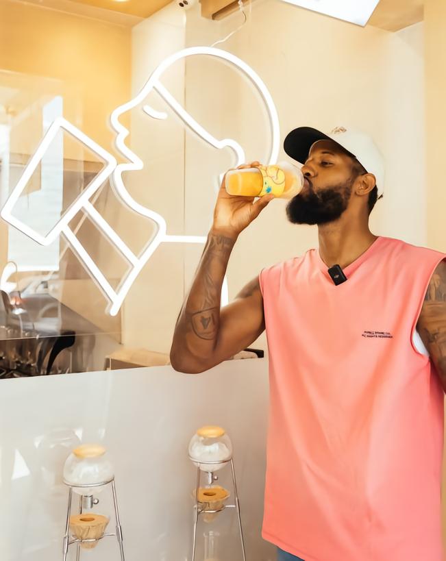 保罗-乔治今天按时出席活动,现身喜茶店柜台,为顾客打包饮料,同时为到场顾客送出30个限量亲签的托特包。