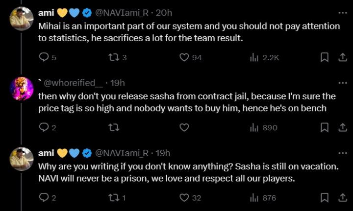 ami回复:“如果你什么都不知道,你为什么要评论?sasha还在度假。NAVI永远不会成为监狱,我们热爱并尊重我们所有的选手。”