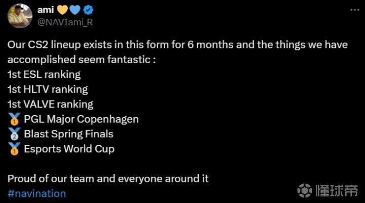 ami写道:“我们CS2的这套阵容刚刚使用了6个月时间,就达成了这些令人耀眼的成绩:ESL排名第一、HLTV排名第一、V社排名第一、PGL哥本哈根Major冠军、BLAST春决亚军、电竞世界杯冠军,我为我的队伍和每个成员感到骄傲。”
