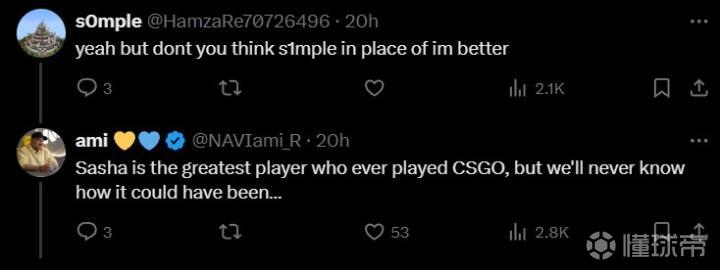 ami表示:“Sasha(s1mple)是CSGO史上最伟大的选手,但我们不会知道他入队后会带来什么影响......。Mihai(iM)是我们团队中重要的一环,而且你不能只关注他的数据,他为队伍做出了很多牺牲。”