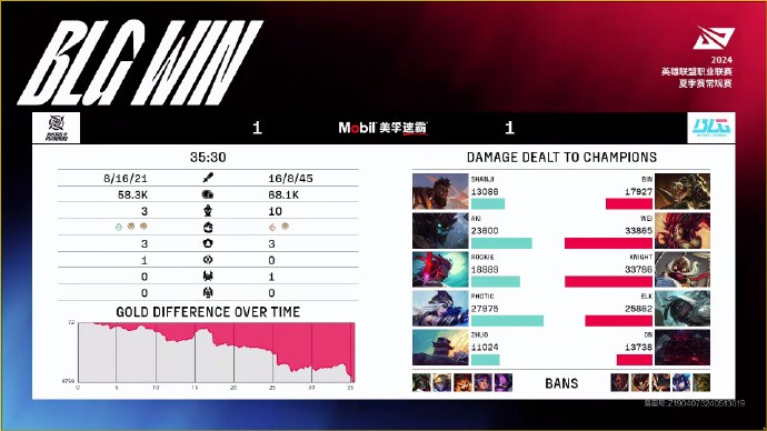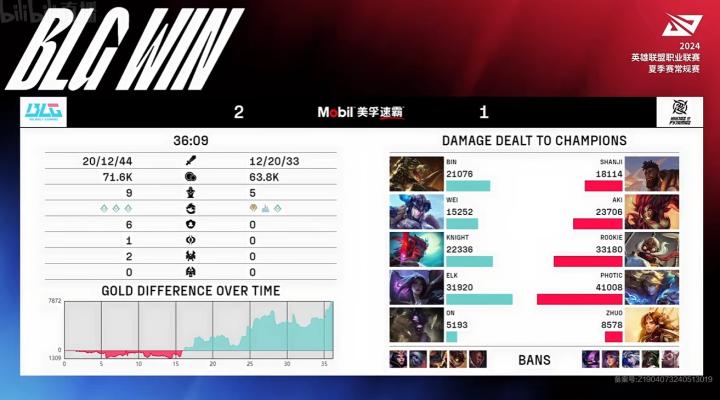 第34分钟,野区团战,BLG打出0换3,顺势一波结束比赛。