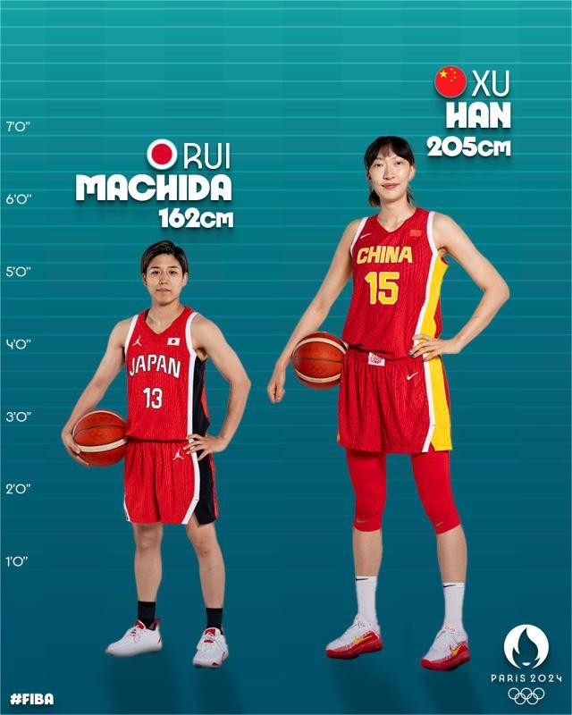 本届奥运女篮最大身高差:韩旭2.05米&町田瑠唯1.62米