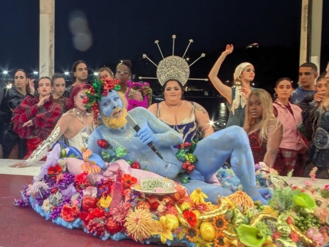 开幕式上,在塞纳河的船只上进行了舞蹈、歌唱等各种表演。这时,希腊神话中的酒神狄俄尼索斯也登场了。当红毯上的餐盖揭开时,一名全身涂成蓝色的男子依靠在五彩缤纷的花朵上现身。