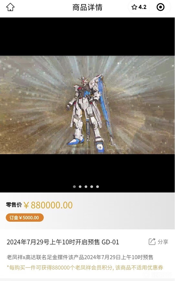 7月26日,著名黄金品牌老凤祥与高达联合发布了黄金高达藏品,并限量发售。其中纯黄金打造的1000g高达的价格为88万元。
