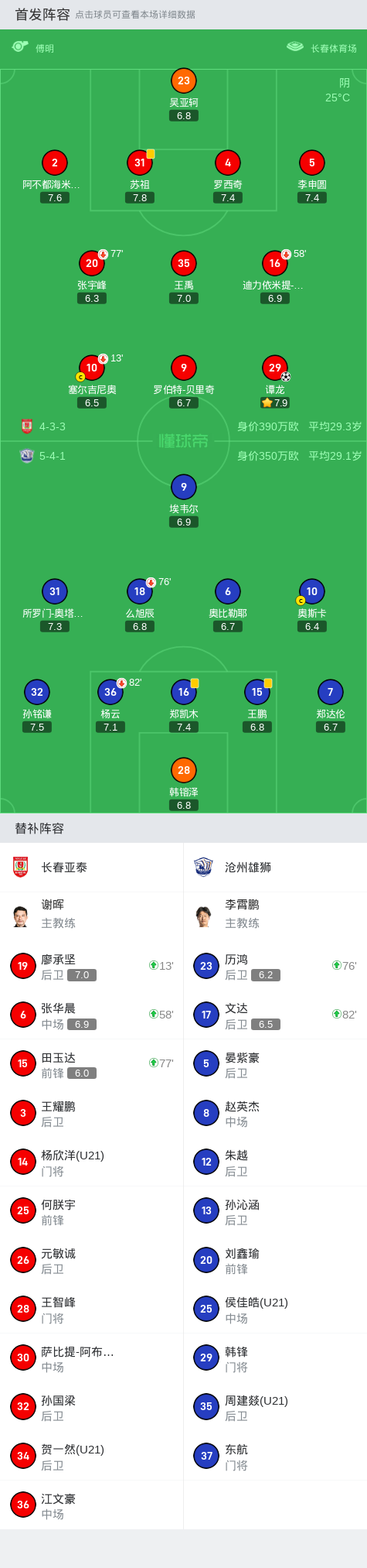 北京时间7月27日,中国足球顶级联赛第20轮,长春亚泰主场迎战沧州雄狮。比赛第13分钟,塞尔吉尼奥无对抗下受伤后离场,第33分钟,么旭辰似传似射击中门柱,第88分钟,谭龙在混战中取得进球。最终,长春亚泰以1-0战胜沧州雄狮,终结球队连续4场比赛不胜。