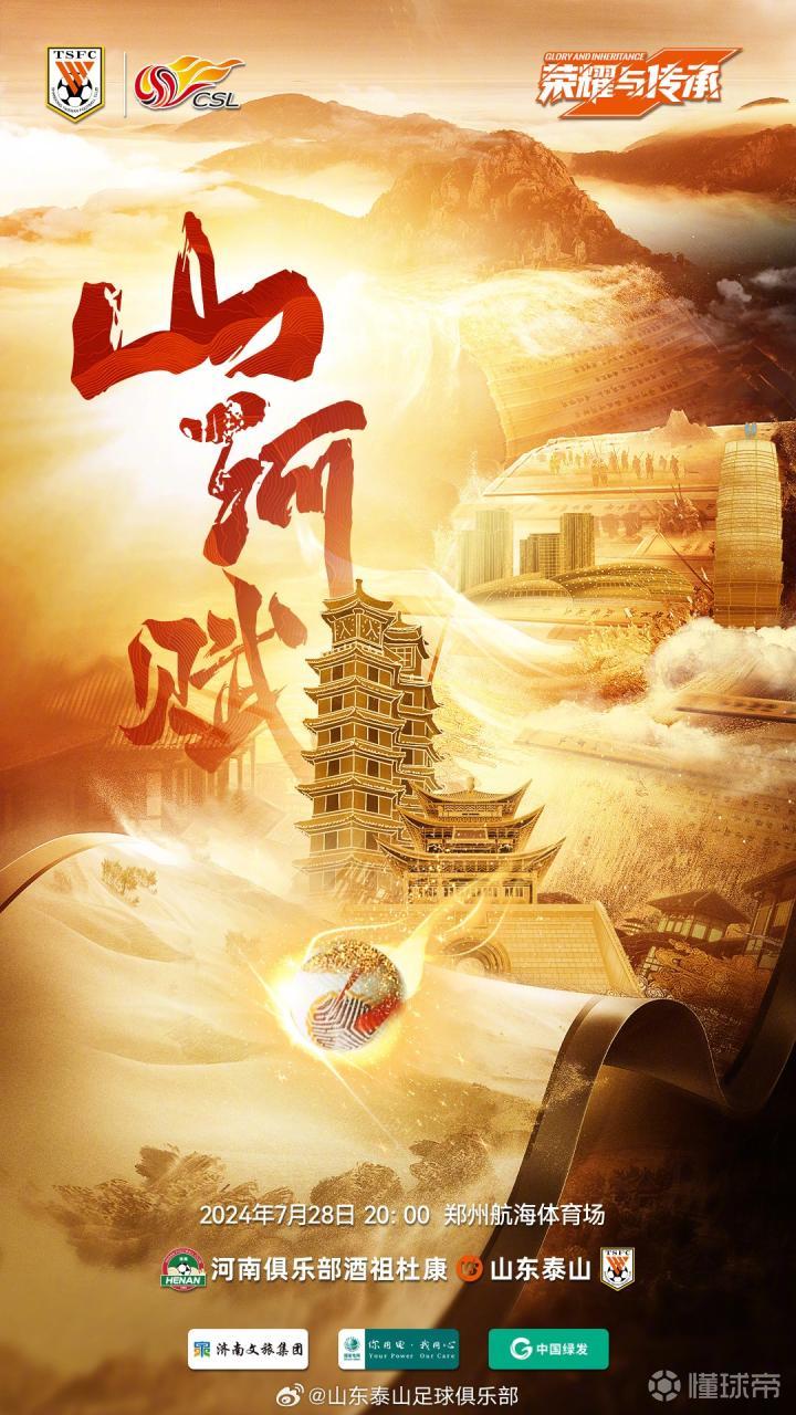 今日,山东泰山官方发布了比赛海报,海报主题为“山河赋”,海报中有郑州二七纪念塔、千玺广场等郑州标志性建筑。