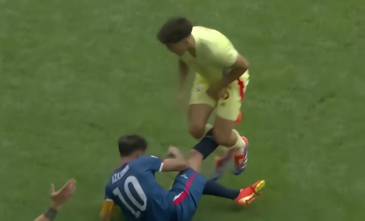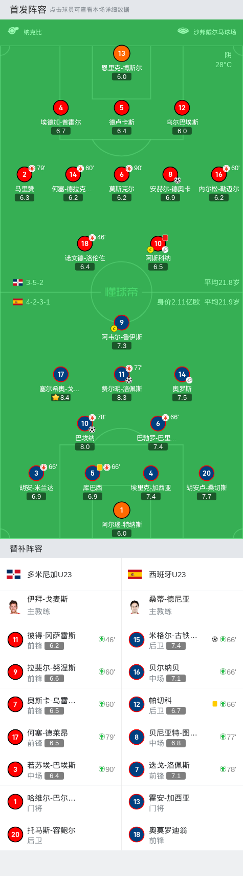 在北京时间7月27日进行的奥运男足小组赛第2轮比赛中,多米尼加国奥迎战西班牙国奥。上半场博斯尔出球失误,费尔明抢断后推射破门,之后多米尼加角球机会,德奥卡头球扳平,半场尾声阿斯科纳附加动作踹到库巴西裆部,裁判将其红牌罚下。下半场巴埃纳远射折射破门再度领先,之后古铁雷斯破门扩大比分。最终西班牙国奥3-1战胜多米尼加国奥提前出线。