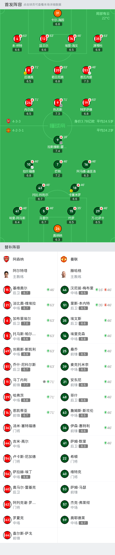 第26分钟,热苏斯门前抢点破门扳平比分,曼联1-1阿森纳