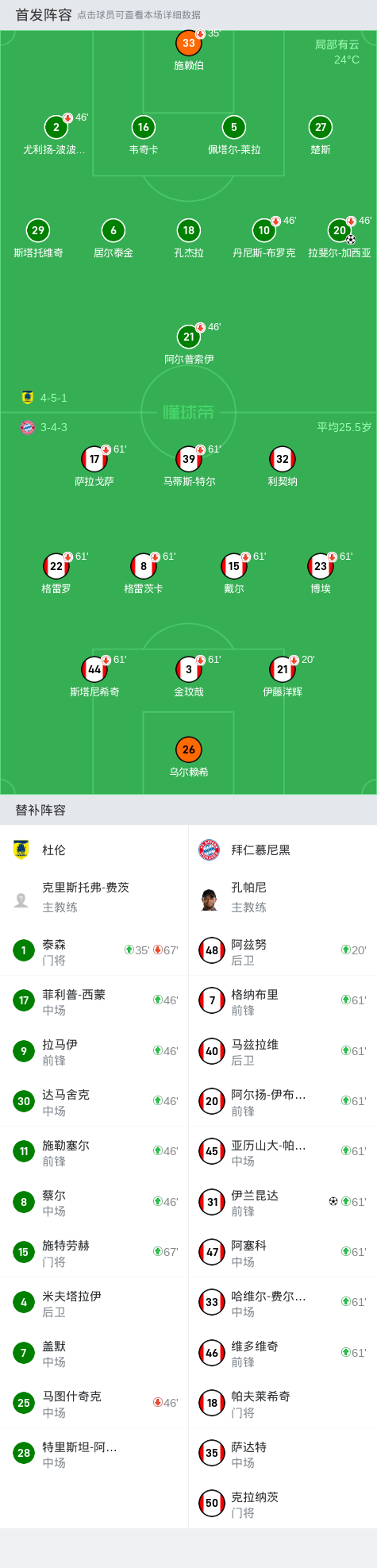 第19分钟,拜仁换人,伊藤洋辉受伤无法坚持被换下,换上阿兹努