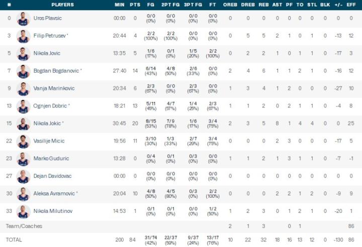 塞尔维亚男篮约基奇20分5板8助4断,博格丹14分6板1助1断,多比利奇13分2板1断