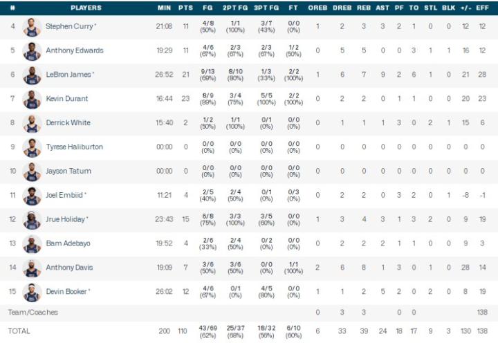 本场美国男篮运动战69投43中,其中三分球32中18。数据方面,美国男篮杜兰特9中8得到23分2板,詹姆斯21分7板9助,库里11分3板3助,朱-霍勒迪15分4板3助2断; 塞尔维亚男篮约基奇20分5板8助4断,博格丹14分6板1助,多比利奇13分2板。