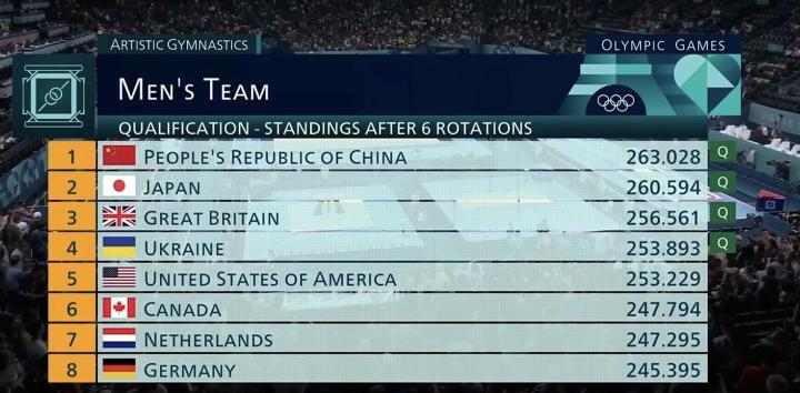 巴黎奥运会体操男子资格赛中,中国体操男队发挥出色,以总分263.028分位列男团资格赛第一,领先日本男队2.434分。