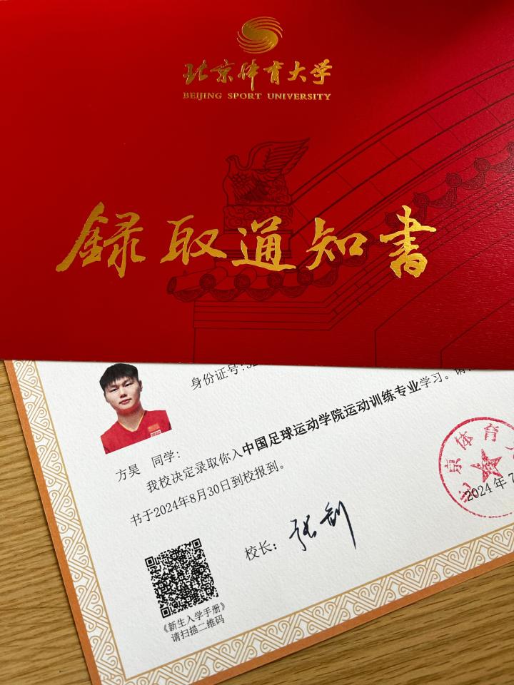 北京时间7月29日,国安前锋方昊更新了微博,晒出了北京体育大学的录取通知书。
