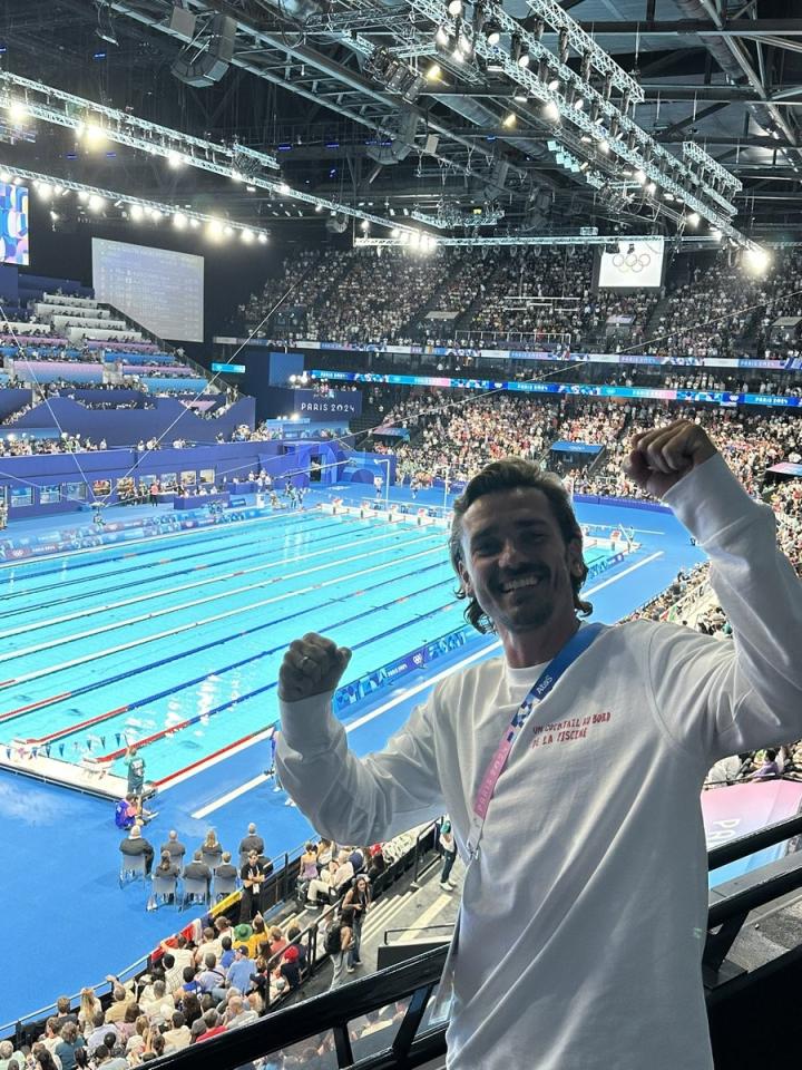 格列兹曼现场看奥运游泳比赛,祝贺法国选手马尔尚夺金