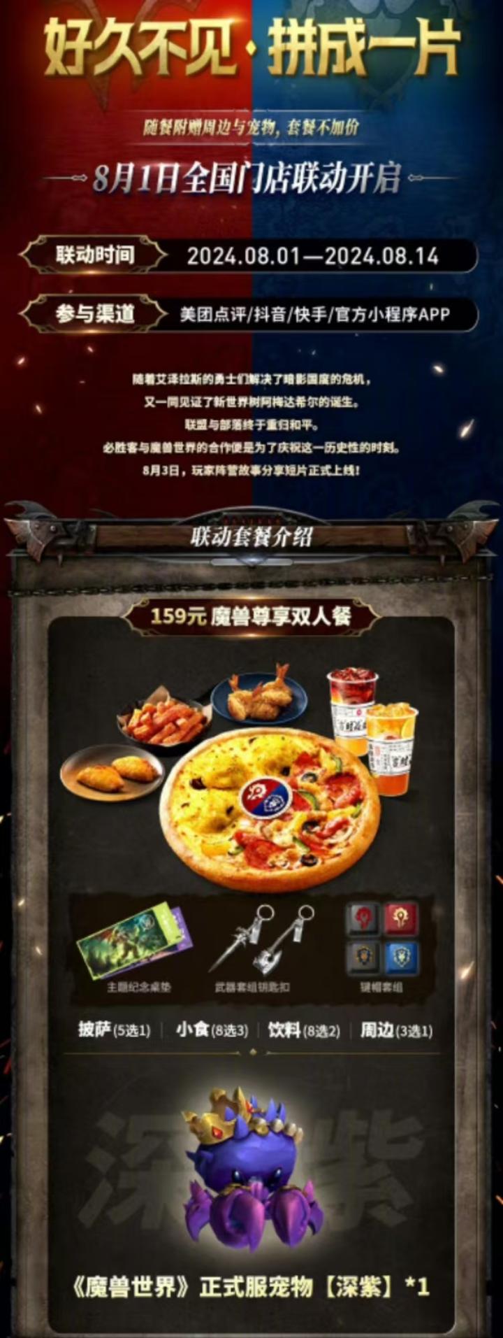 游戏未到,披萨先行!《魔兽世界》联动必胜客套餐8月1日上线自赫 @懂球帝2024-07-30 20:01日前,《魔兽世界》官方宣布和快餐品牌必胜客展开联动,“魔兽世界×必胜客”套餐在全国各地的必胜客门店有售,售卖时间为8月1日至8月14日,联动套餐的价格从99元至279元不等。国服《魔兽世界》正式回归的日期为8月1日,“地心之战”会在8月27日全球同步上线。此番“魔兽世界×必胜客套餐”上线,可谓是游戏未到,披萨先行。展开更多