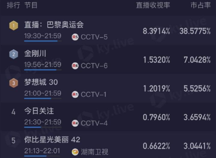 累计超1亿人次收看,王楚钦/孙颖莎比赛收视率碾压级领先我的靴子里面有蛇 @懂球帝2024-07-30 21:52北京时间20:30,巴黎奥运会乒乓球混双决赛,王楚钦/孙颖莎4-2击败朝鲜黑马李正植/金琴英组合,据统计,本场央视收视率遥遥领先。中央5本时段的直播收视率达到8.39%,领先第二位的中央6足足有6%多,累计超过1亿人次通过中央5收看了本场比赛。市占率方面,中央5本时段也是断层级领先。展开更多
