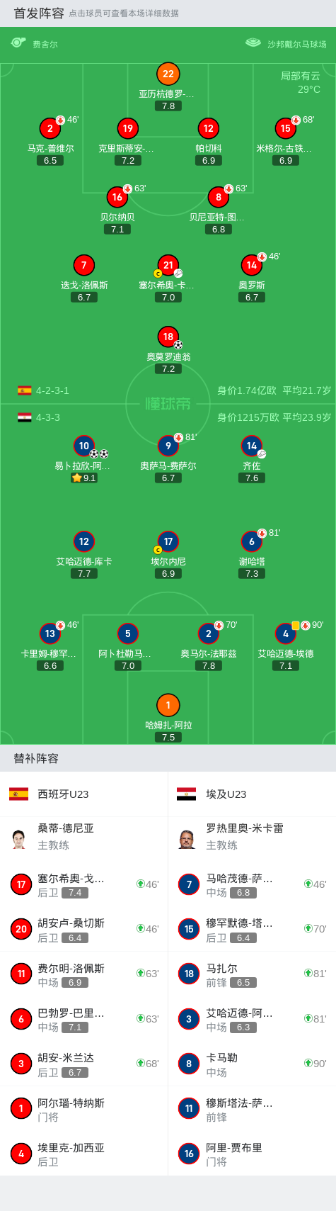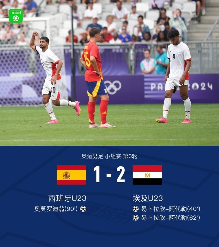 奥运男足西班牙爆冷1-2埃及跌至小组第二,埃及头名出线