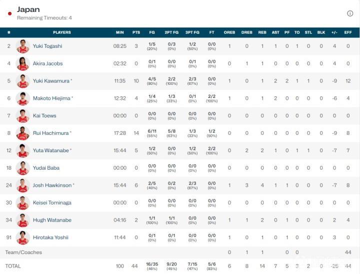 北京时间7月30日,奥运男篮小组赛,日本对阵法国的比赛正在进行,半场结束,日本44-49法国,日本仅落后法国5分。