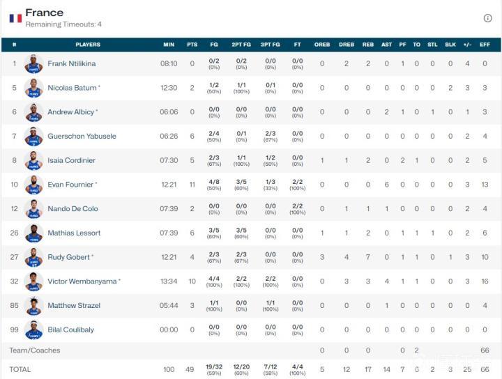 法国:戈贝尔4分7篮板,文班亚马10分3板4助攻,富尼耶11分6助攻