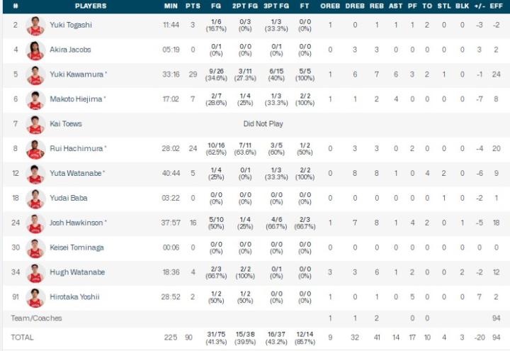 日本男篮河村勇辉29分7篮板6助攻;八村塁24分3篮板;霍金森16分8篮板。