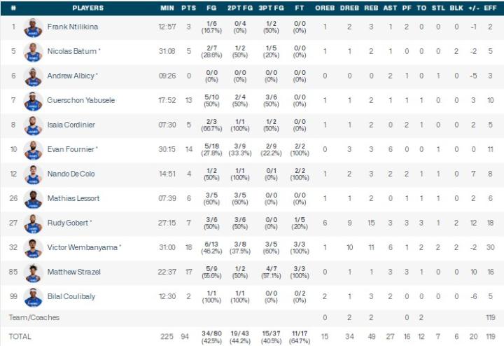 法国男篮文班亚马18分11板2断2帽,斯特拉泽尔15分,富尼耶14分3板6助1断。