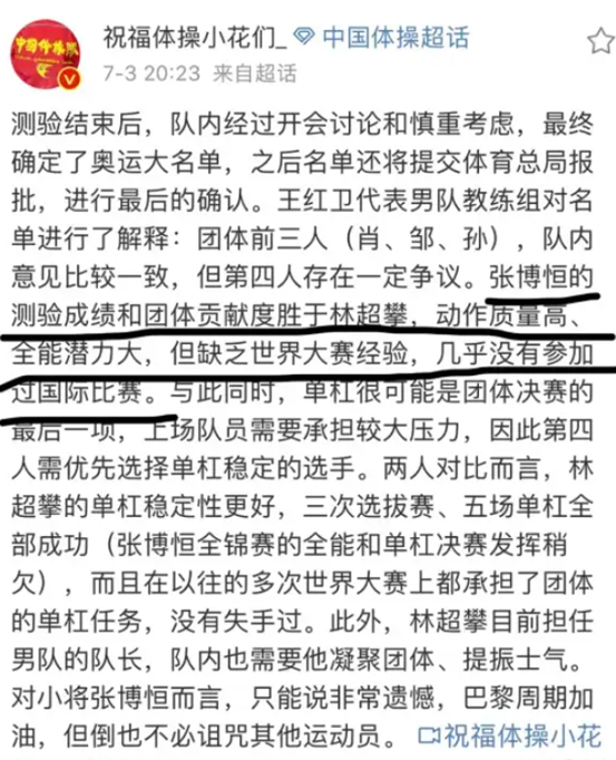 在张博恒测验成绩和团体贡献度胜于林超攀的情况下,最终教练组以张博恒“大赛经验不足”,林超攀“单杠更加稳定,且是队长能凝聚团体”作为依据,让林超攀成为了最后一人。