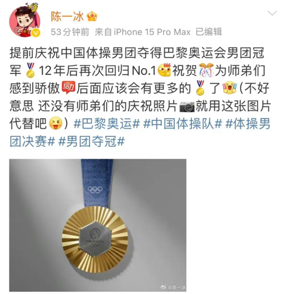 这样巨大的优势,让老队长陈一冰都忍不住提前发微博“庆祝”中国体操时隔12年再夺男团金牌,可能连他都不会料到,自己的“开香槟”竟然会“翻车”。