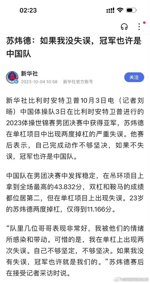 哪怕苏炜德只出现一次掉杠失误(两次掉杠扣两分),中国队最终的命运都会不一样,但可惜的是命运却没有如果,两次掉杠让苏炜德再次被钉在了耻辱柱上,队友们的不甘与落寞反倒在舆论的汹涌中显得更加难以名状。