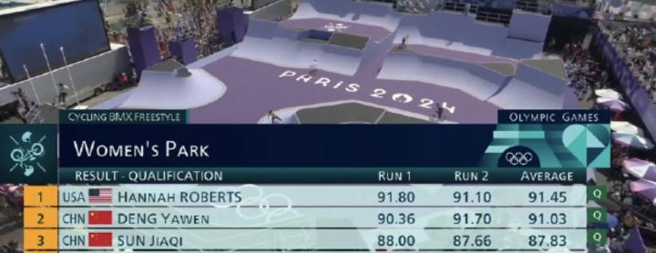 巴黎奥运会女子自由式小轮车公园赛预赛,美国名将、五次世锦赛冠军汉娜-罗伯茨预赛第一,两位中国选手邓雅文和孙佳琪分列第二和第三位。