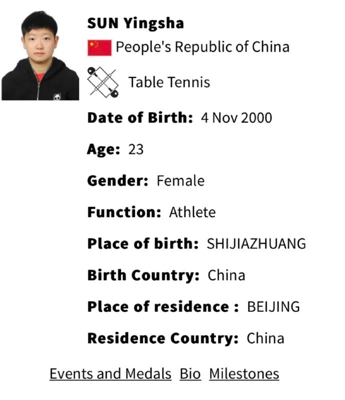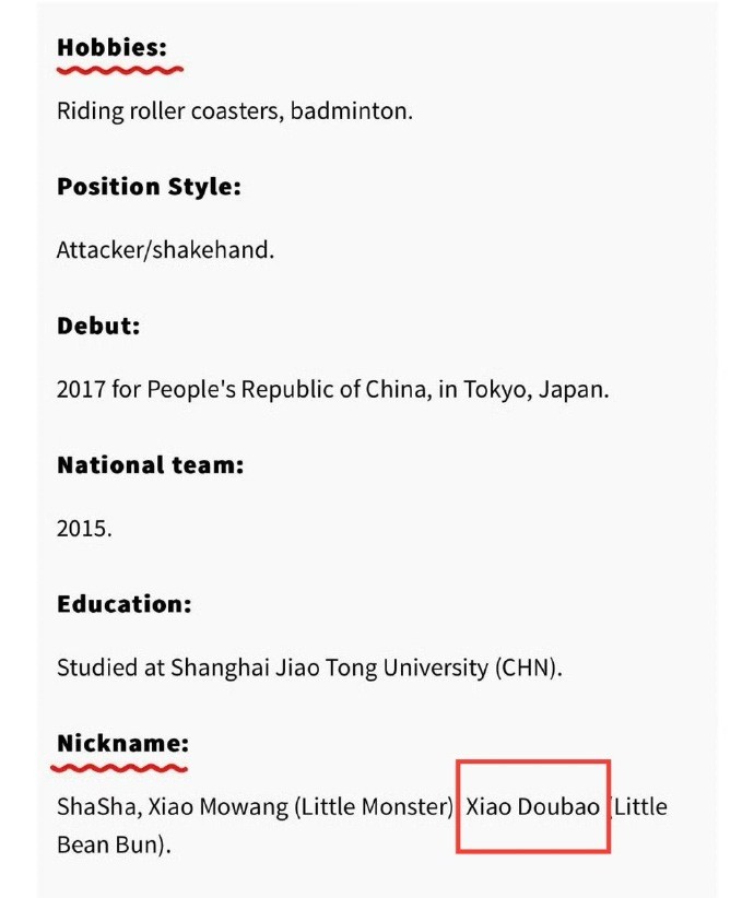 孙颖莎奥运简历:昵称小豆包、小魔王,爱好过山车、羽毛球ZeroTsu_02 @懂球帝2024-07-31 11:43中国乒乓球运动员孙颖莎的奥运会简历写的非常详细,她在自己的昵称一列中写道小魔王、小豆包。在昵称中,孙颖莎写道:莎莎、小魔王(Little Monster)、小豆包(little bean bun)。而在自己的爱好一列中,孙颖莎写道:坐过山车、打羽毛球。展开更多