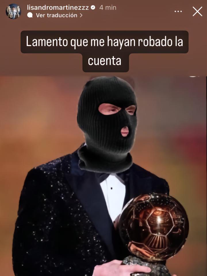 利马社媒账号被盗,然后发了梅西“抢劫”金球奖的图片ETChalmers @懂球帝2024-07-31 13:28曼联的阿根廷后卫利桑德罗-马丁内斯的社交媒体账号被盗,随后发布了一张梅西“抢劫”金球奖的图片。利桑德罗-马丁内斯的社交媒体账号疑似被盗,随后该账号在Story上发布了一张梅西戴着头套捧着金球奖的PS图片,并配文:“很遗憾,我的账号被盗了。”该图片此前被人用来讽刺梅西“抢劫”金球奖。目前尚不清楚这张图片是否为利桑德罗-马丁内斯本人所发,不过该动态现已被删除。展开更多