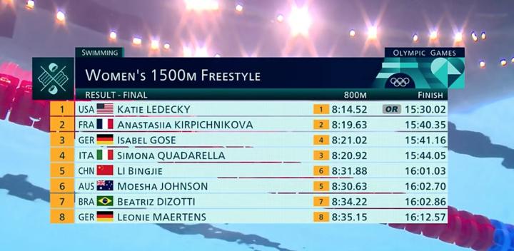 女子1500米自由泳决赛:李冰洁第五,美国名将莱德基破奥运纪录华小岚 @懂球帝2024-08-01 03:37北京时间8月1日凌晨,2024年巴黎奥运会女子1500米自由泳决赛,中国选手李冰洁以16分01秒03的成绩排名第五。美国选手、世界纪录保持者莱德基以15分30秒02的成绩遥遥领先,并打破奥运会纪录,同时拿到了她个人在奥运会的第8枚金牌。法国选手阿纳斯塔西娅-基尔皮奇尼科娃获得银牌,德国选手伊莎贝尔-格泽获得铜牌。展开更多
