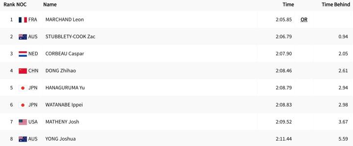 东道主法国的选手马尔尚游出了2分05秒85的成绩,刷新了奥运会纪录。