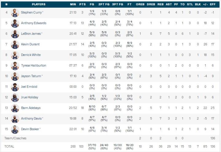 美国男篮库里3分4助,詹姆斯12分7板5助6失误,阿德巴约18分7板,杜兰特14分2板3助;