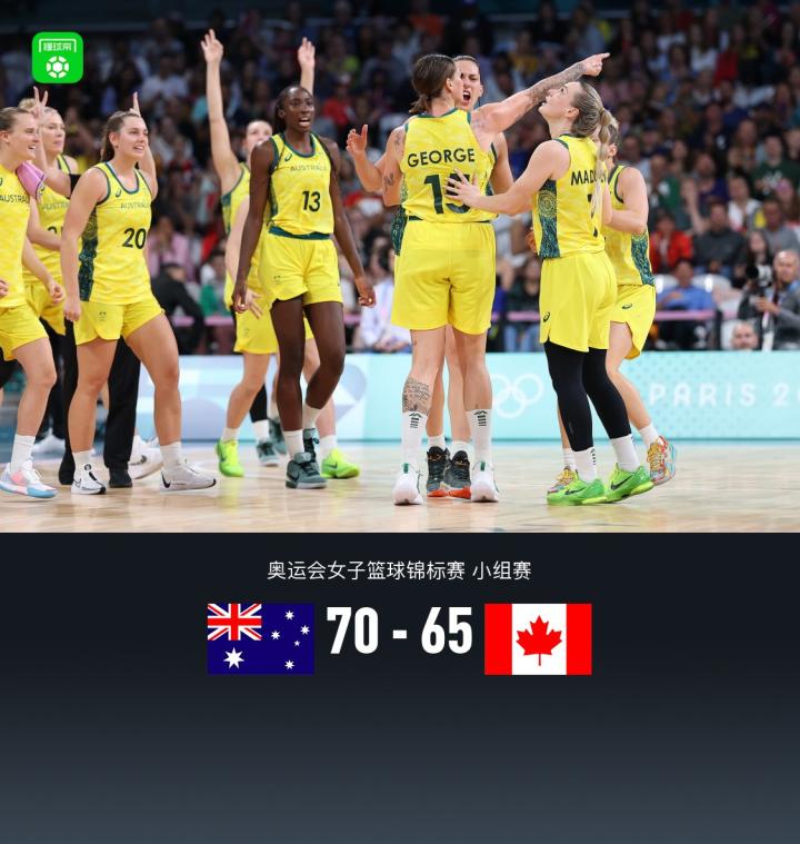 第四节澳大利亚女篮萨米-惠特科姆拿下7分,加拿大女篮起亚-努尔斯拿下7分,最终澳大利亚女篮70-65战胜加拿大女篮