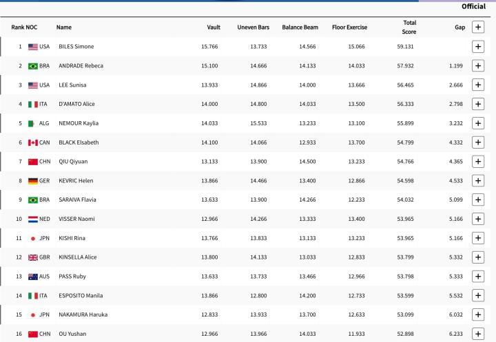 拜尔斯在本场比赛中展现出了统治级的实力,虽然在高低杠项目中出现失误,但还是以59.131分成功夺冠,中国选手邱祺缘54.766分排名第7,另一名中国选手欧钰珊52.898分排名第16。
