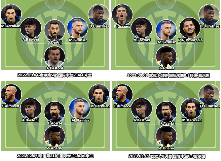 2022/23赛季初期,国际米兰起步不顺,连续输给拉齐奥、拜仁慕尼黑、AC米兰和罗马,小因扎吉一度被汹涌而来的下课声包围。身处绝境之地,小因扎吉一边大胆推动轮换,保证球员在关键比赛中的体能,一边从拔擢奥纳纳入手,调整防线结构,连胜巴塞罗那和萨索洛的比赛成为了这个赛季转折点,他们在这两战中比对手多跑了近11公里。
