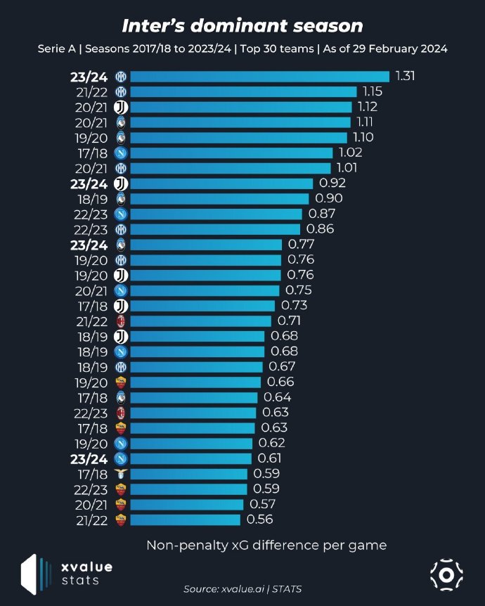 (图)作为2017/18赛季以来,意甲单赛季平均xGD最大的球队(进球期望值-丢球期望值,不含点球),国米本赛季在进攻端的表现非常高效。