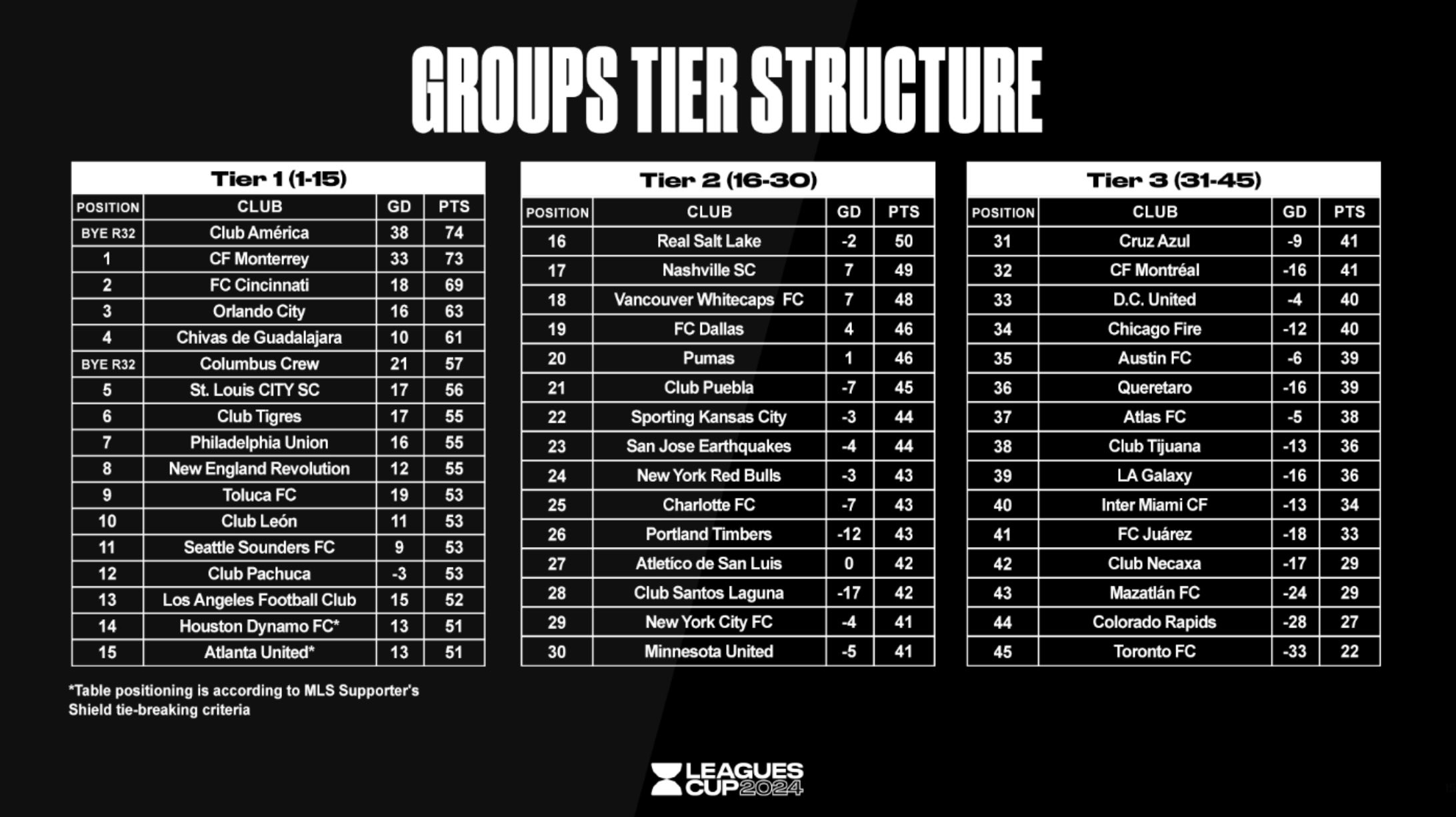 2024北美联杯简介! 一、参赛球队:全部29支美职联球队+18支墨超球队 分组:①美职联总冠军哥伦布机员、墨超春秋两赛季成绩最好的美洲可直接晋级32强②其余45支球队按联赛成绩分成3档,每档1支球队形成一个小组,每组前二晋级32强。 二、主客场特权:①哥伦布机员拥有直至决赛的主场特权②美洲拥有直至半决赛的主场特权③一档中墨超成绩前三的俱乐部也拥有一定的主场特权:蒙特雷拥有直至八分之一决赛的主场特权;瓜达拉哈拉拥有直至十六分之一决赛的主场特权;墨西哥老虎拥有小组赛主场特权(这意味着迈阿密国际将在客场挑战墨西哥老虎)④除以上情况外,墨超球队与美职联球队的比赛,主场都为美职联球队⑤墨超球队之间的比赛,主场由委员会决定⑥美职联球队之间的比赛由分档排名决定。 三、点球大战:北美联杯全赛程不设加时,没有平局。小组赛打平进行点球大战,胜者积2分,负者积1分;淘汰赛90分钟打平,同样直接进入点球大战。 四、红黄牌:累计3张黄牌,自动停赛1场;八分之一决赛后,黄牌清零。