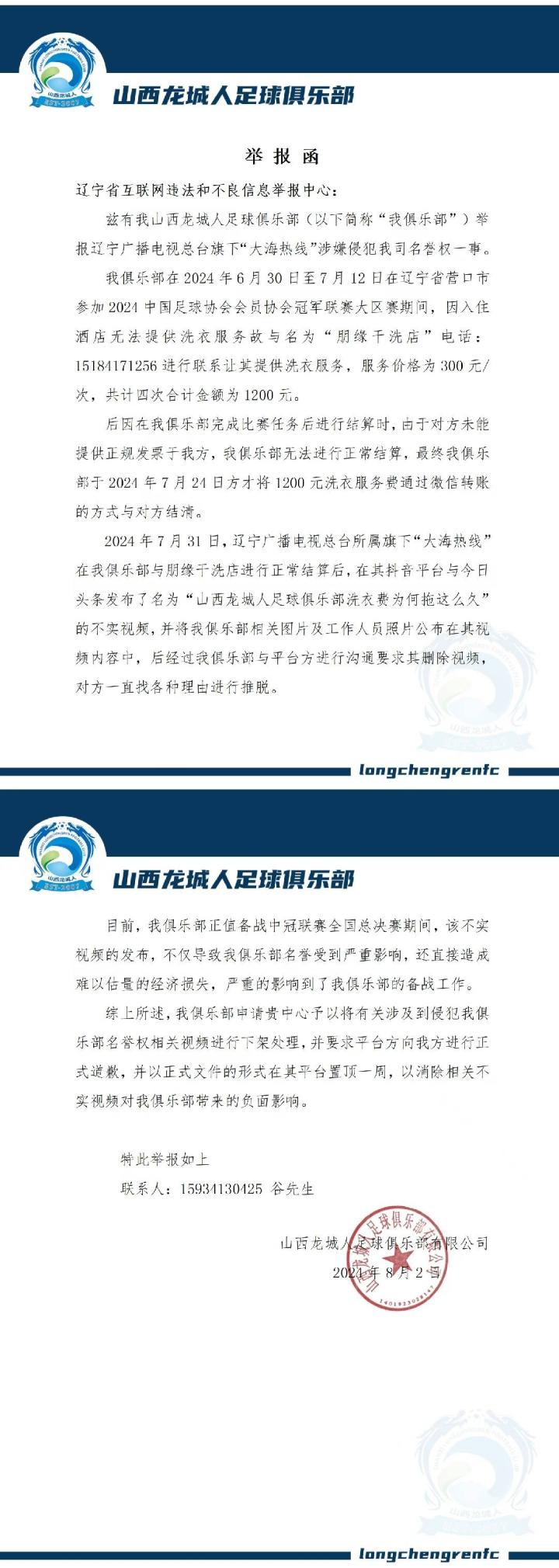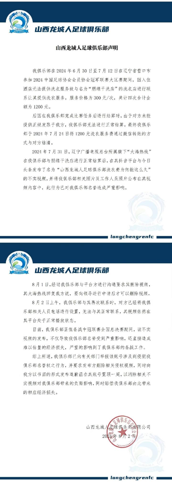 8月1日,在《大海热线》新闻报道出来后,山西龙城人足球俱乐部发表声明回应:我俱乐部在营口赛区比赛期间,因入住酒店无法提供洗衣服务,故与营口当地洗衣店经过沟通后委托其提供相关服务。离开赛区前结算相关费用时,因洗衣店当时无法提供正规发票故未能立即与其结算,当俱乐部返回太原后一周内,方与其结清相关费用。截止本声明发表之日,我俱乐部已与营口赛区所有合作方费用全部结清。