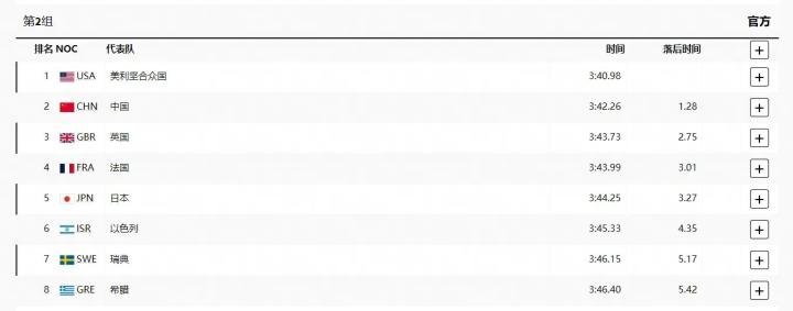 中国队的总成绩为3分42秒26,排名所有预赛队伍第3名。美国队(3分40秒98)、澳大利亚队(3分41秒42)分别排名前两位。