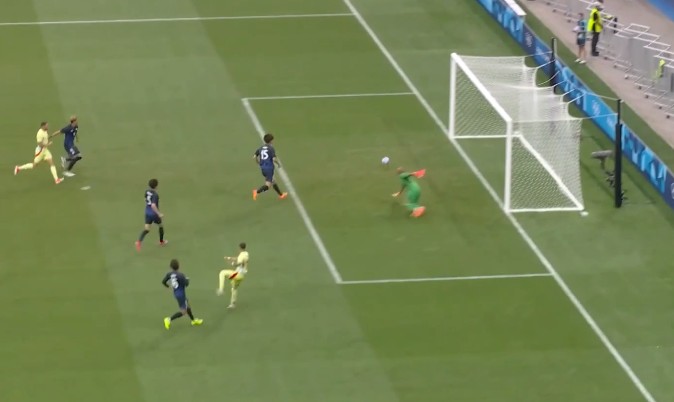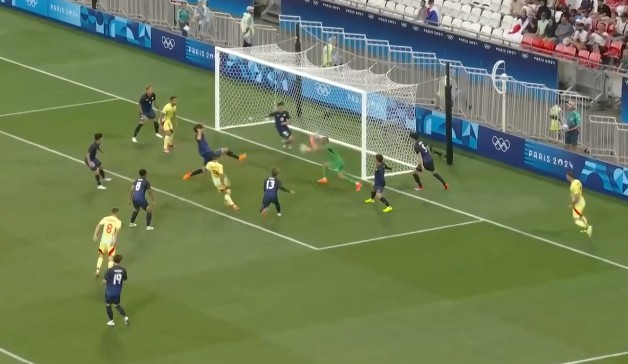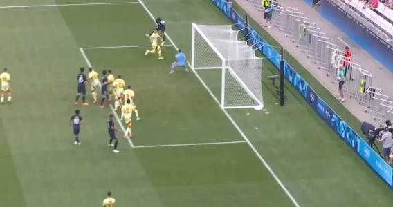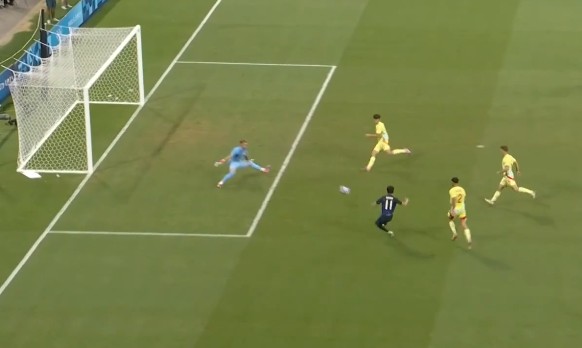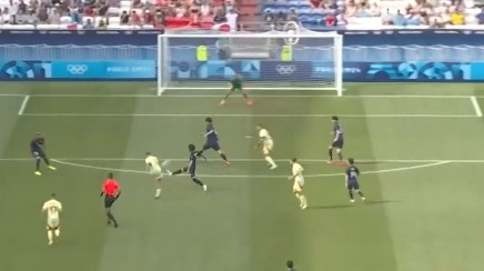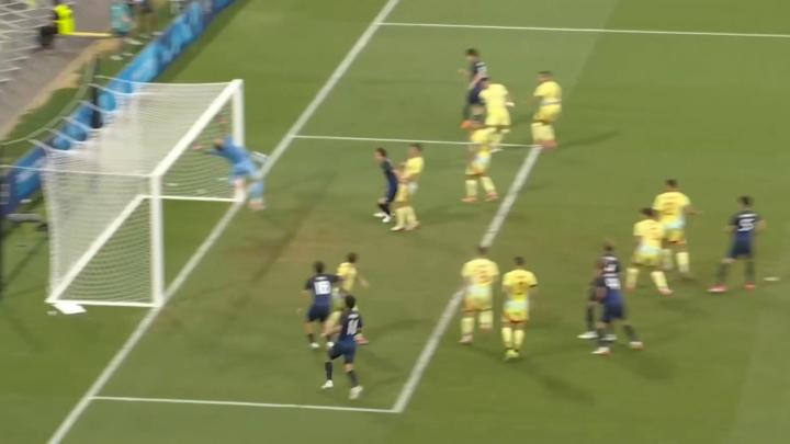 第88分钟,日本国奥角球开出,高井幸大抢前点头槌击中门框