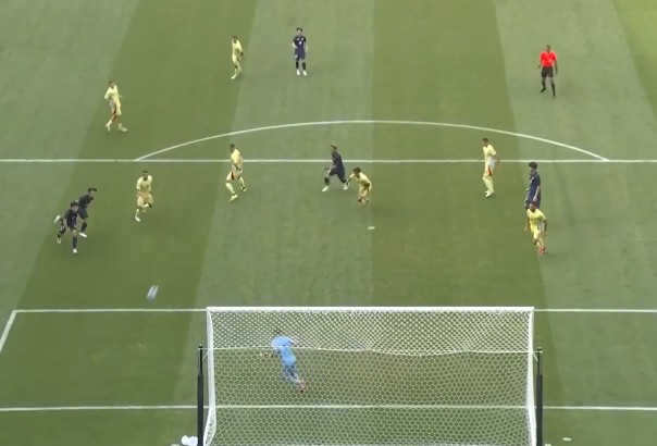 第45+7分钟,日本国奥定位球攻势,细谷真大后点头槌击中立柱