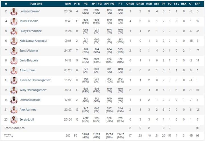 西班牙男篮达里奥-布里苏埃拉17分1板,塞尔吉奥-鲁尔13分3板4助,阿布里内斯12分3板2助。
