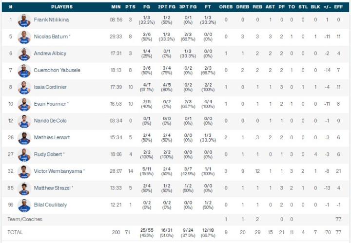 法国男篮文班亚马14分11板1助2断1帽,富尼耶10分1板1助,科尔迪尼耶10分1板1助1断1帽;