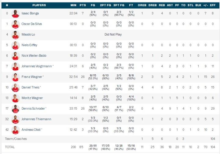 德国男篮施罗德26分4板9助1断,弗兰兹-瓦格纳26分5板2助1断1帽,莫里兹-瓦格纳8分1板1助。